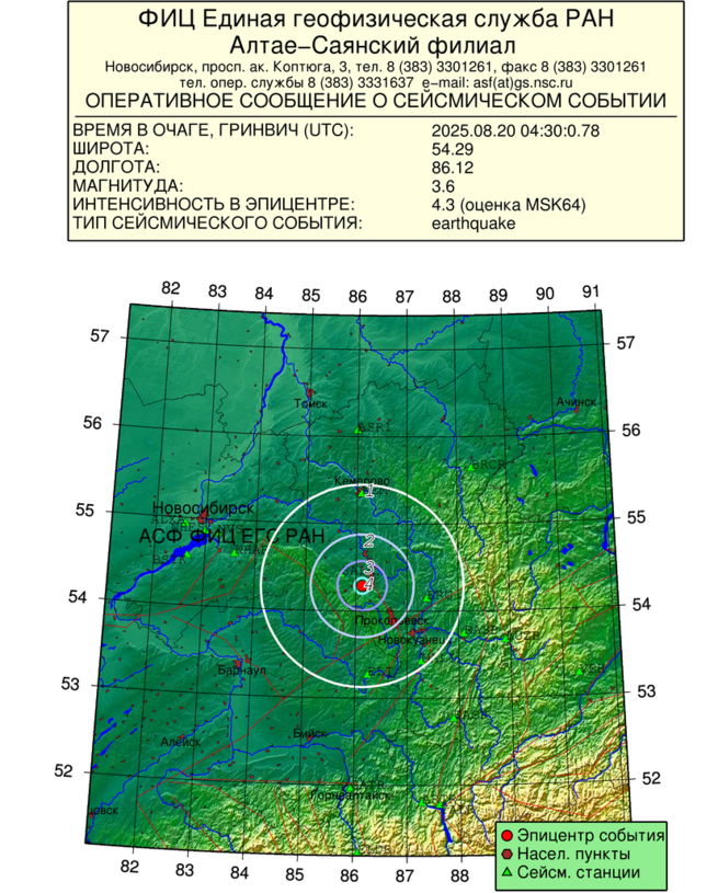 Магнитуда сейсмособытия составила 3,6 балла, интенсивность в эпицентре достигла 4,3 балла по шкале MSK64.