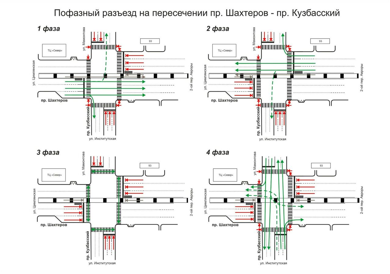Так, в первую фазу поедут машины и трамваи по Шахтеров от улицы Цимлянской, во вторую – в обратную сторону, в третью – пойдут пешеходы во всех направлениях, а в четвертую – транспорт поедет по проспекту Кузбасскому и улице Мамонтова.
