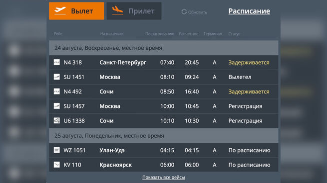 Также в разделе прилета на сайте воздушной гавани сообщается о задержках рейсов из Сочи и Санкт-Петербурга. Вместо запланированного времени в 7:45 самолет из Сочи приземлится в 15:05, а рейс из Санкт-Петербурга вместо 6:35 прибудет в 19:26.