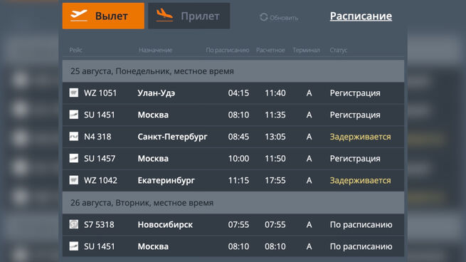 Вылет в Улан-Удэ перенесен с 4:15 на 11:40, вылет в Санкт-Петербург вместо 8:45 состоится в 13:05, а рейс в Екатеринбург, который должен был вылететь в 11:15, теперь запланирован на 17:55. Также перенеслись оба рейса в Москву от авиакомпании "Аэрофлот": с 8:10 на 11:35 и с 10:00 на 11:50.