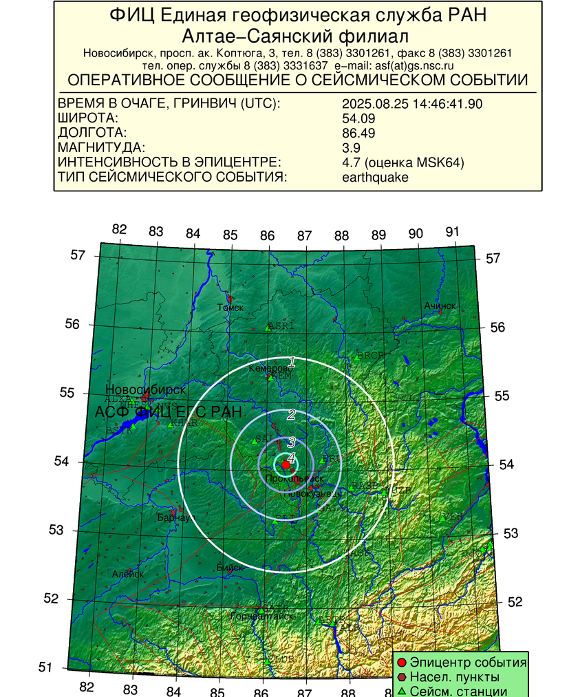 По данным Алтае-Саянского филиала Единой геофизической службы РАН, магнитуда землетрясения составила 3,9 балла, а интенсивность в эпицентре – 4,9 балла по шкале MSK-64.