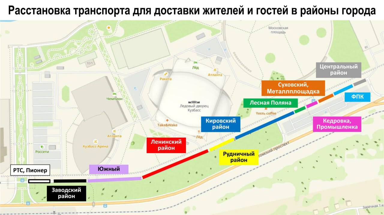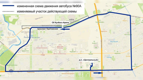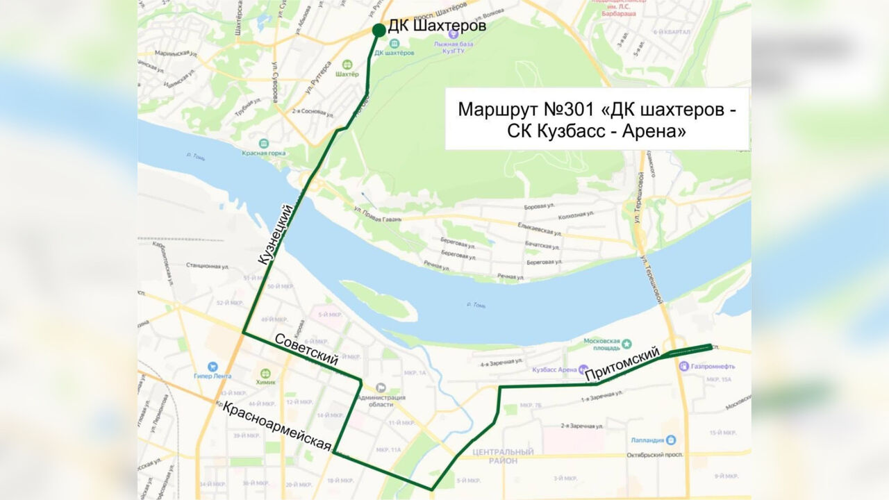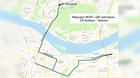- Автобус №301 будет ехать от ДК Шахтеров через Кузнецкий мост, Советский проспект и улицы 50 лет Октября, Красноармейскую и Соборную, а затем по Притомскому проспекту к СК "Кузбасс-Арена".