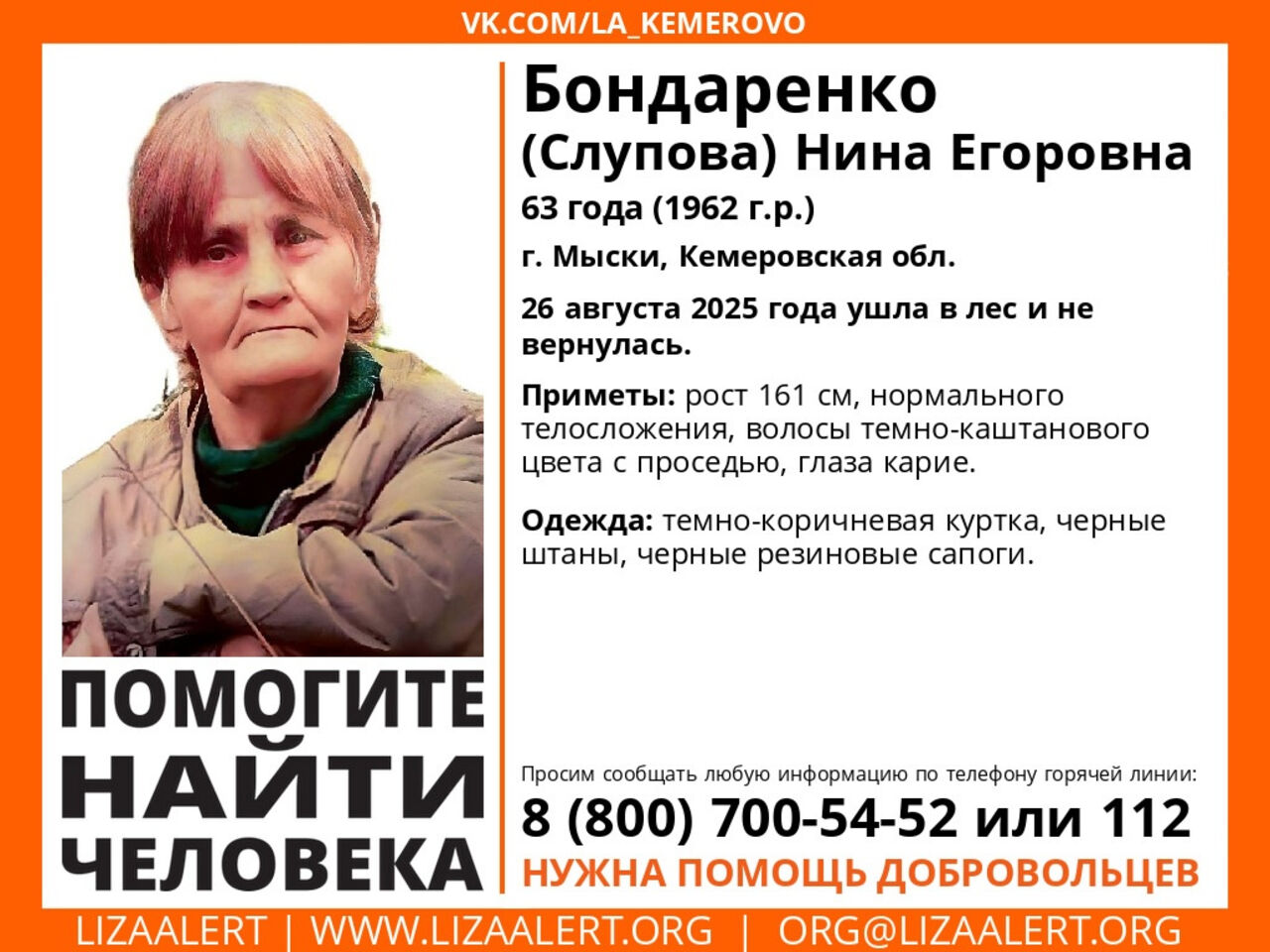 ПСО "ЛизаАлерт" сообщил о пропаже 63-летней жительницы Мысков. Местонахождение Бондаренко (Слуповой) Нины Егоровны остается неизвестным со вторника, 26 августа. Она ушла в лес и не вернулась.