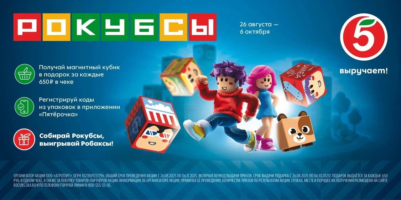 В магазинах "Пятёрочка" стартовала детская акция "Рокубсы", которая продлится до 6 октября. Покупатели могут собрать креативную коллекцию магнитных кубиков и принять участие в розыгрыше подарков и выиграть главный приз – 1 млн рублей. Победитель мобильной игры отправится за приключениями в Китай.