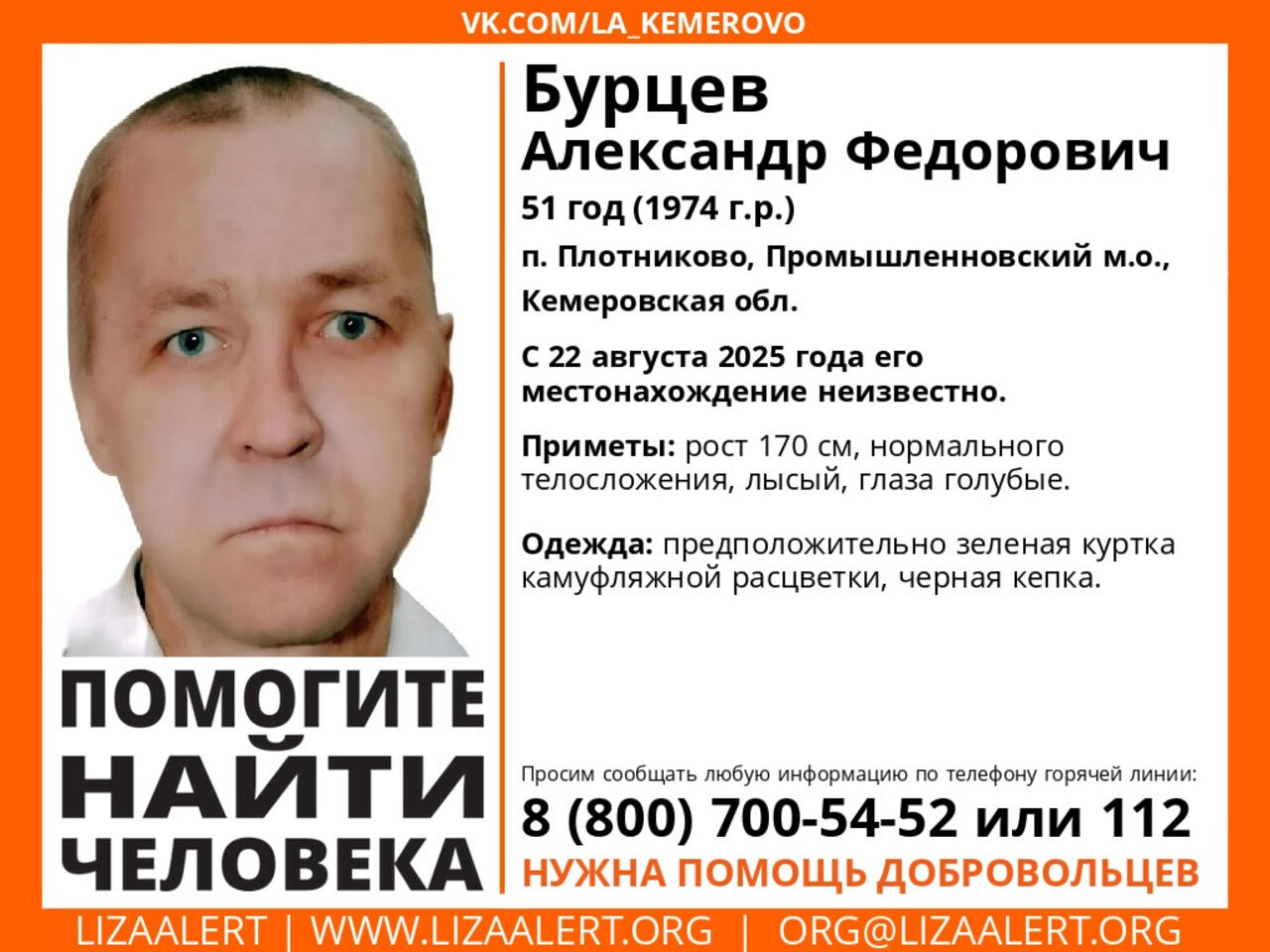 ПСО "ЛизаАлерт" сообщил о пропаже 51-летнего жителя поселка Плотниково Промышленновского округа. Местонахождение Бурцева Александра Федоровича остается неизвестным с пятницы, 22 августа.