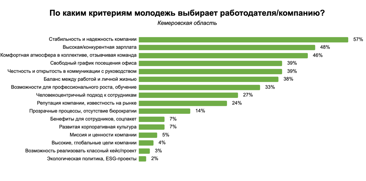Молодежь из Кузбасса считает ключевыми факторами при выборе работы стабильность и надежность компании – такой ответ дали 57% респондентов, для 48% наиболее важна конкурентная зарплата, для 46% – комфортная атмосфера в коллективе. Также среди важных критериев свободный график посещения офиса, баланс между работой и личной жизнью, честность и открытость в общении с начальством, следует из опроса hh.ru и "LADA Цифра".