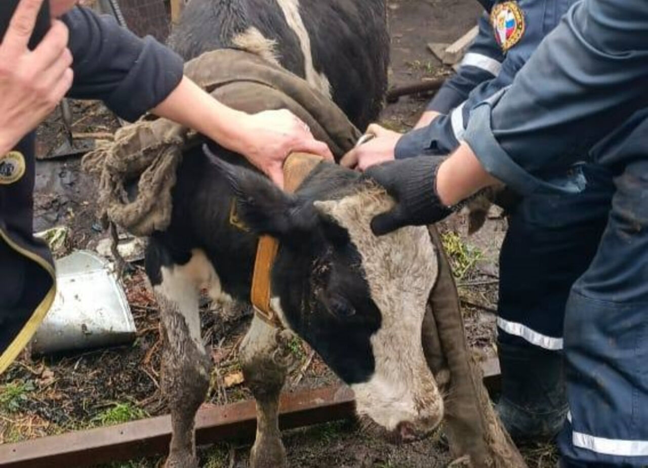 В Кузбассе теленок упал в яму и хозяин не смог достать его. На помощь пришли спасатели.