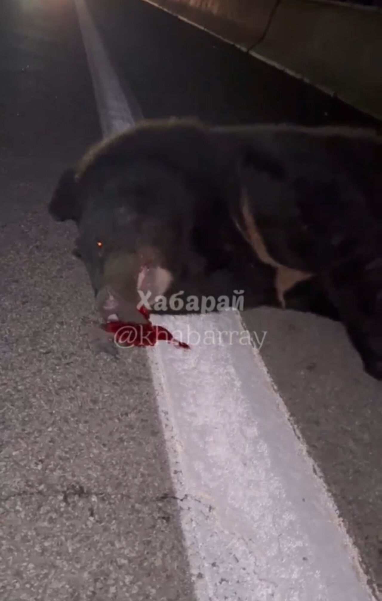 Неизвестный сбил медведя на хабаровской трассе и скрылся. Мертвый хищник остался лежать рядом с проезжающими машинами.