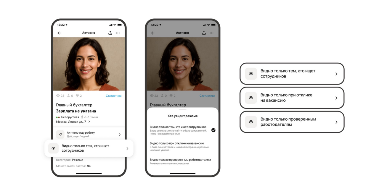Функция доступна для устройств на iOS и Android в свежих версиях приложения, а также на десктопе и в мобильной версии сайта. Теперь после публикации пользователи могут выбрать нужные настройки видимости прямо в карточке резюме. По умолчанию резюме, не скрытое настройками видимости, отображается в поиске и рекомендациях для тех, кто ищет сотрудников. При этом, оно остается недоступным для широкой аудитории платформы – другие пользователи не увидят его при переходе в профиль кандидата.