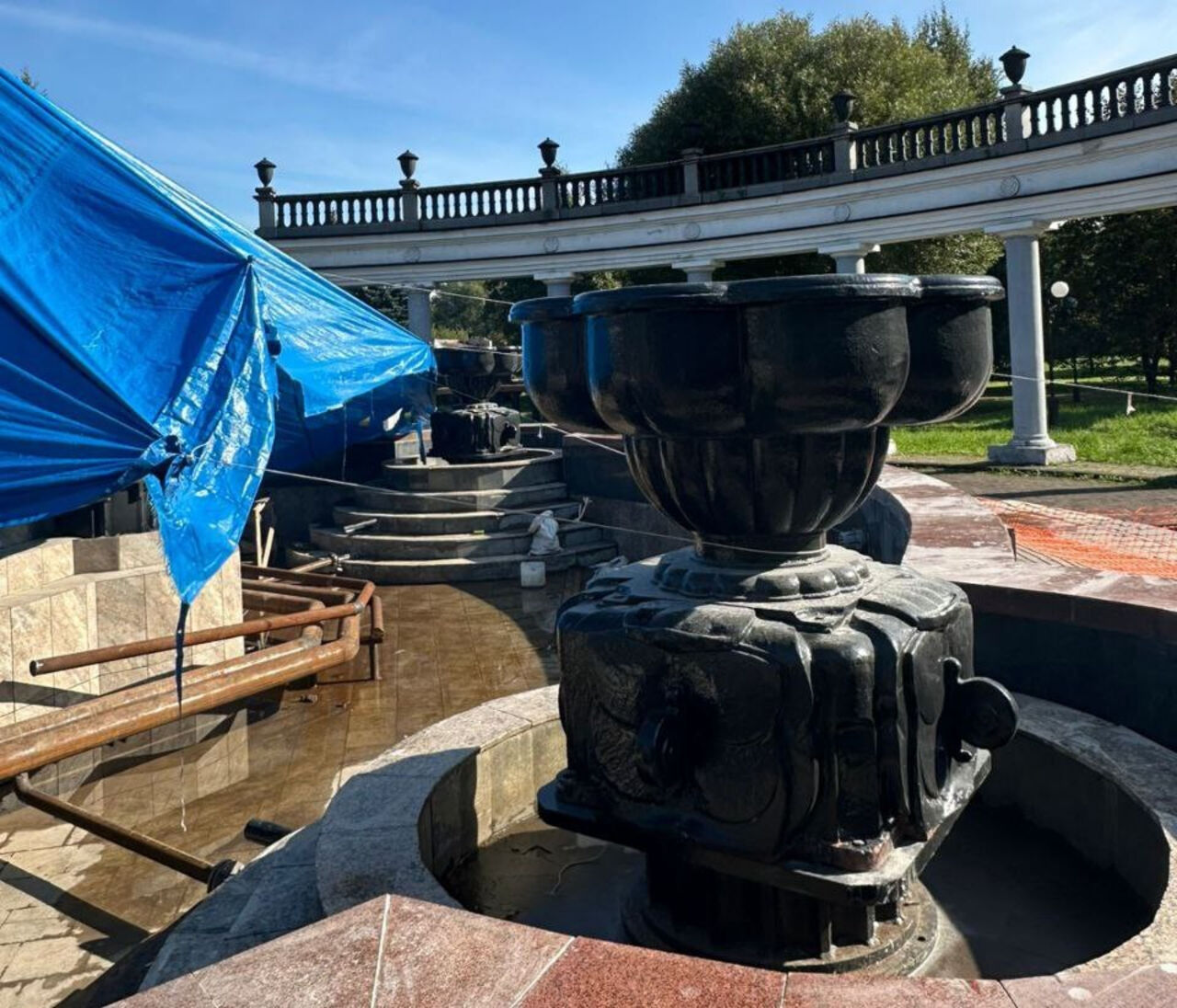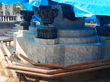 В июне специалисты убрали чаши и получаши фонтана, разобрали облицовку гранитных плит на центральной конструкции трубопровода. Подрядчик зачистил демонтированные элементы от лакокрасочных покрытий и нанес на них грунтовку.