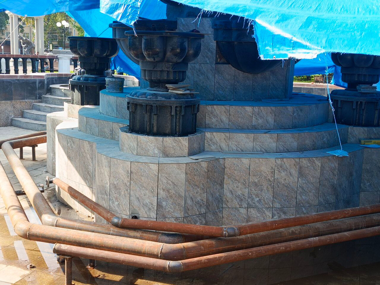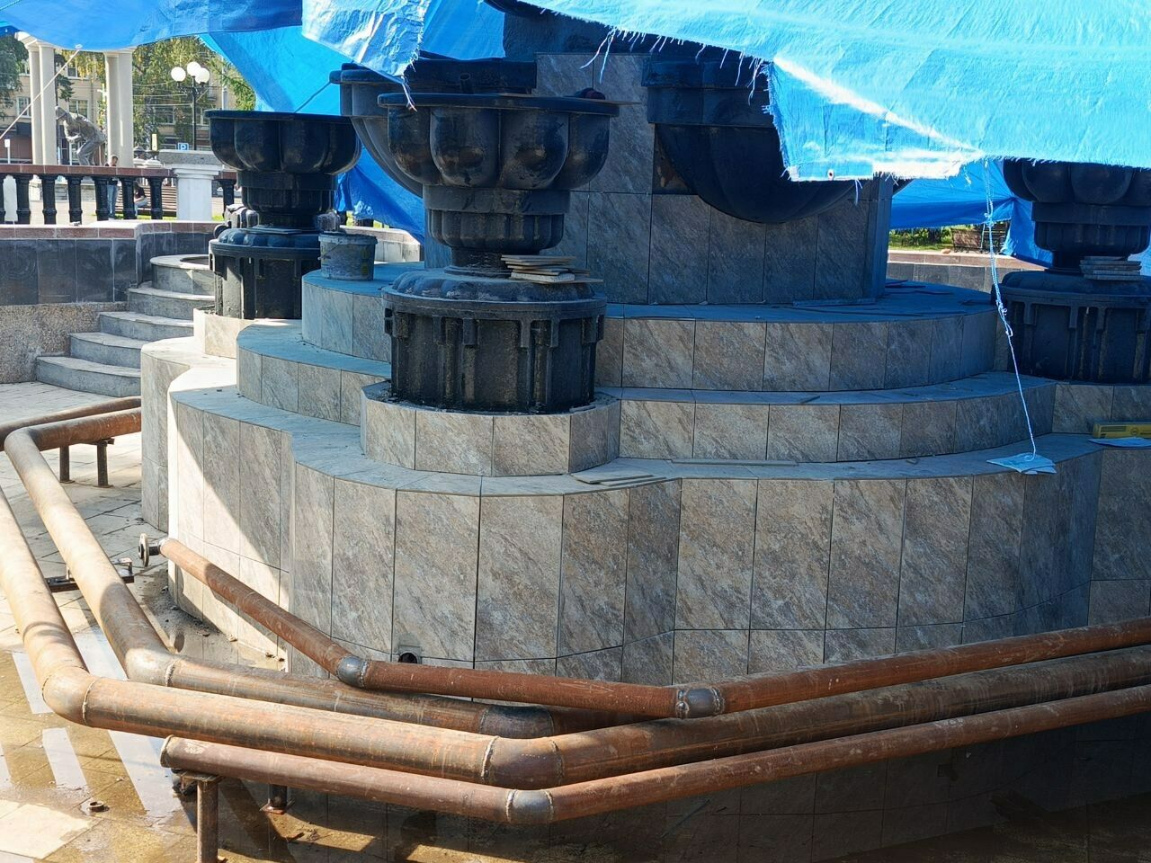 Сейчас все элементы смонтированы и окрашены, идет облицовка фонтана плиткой и шлифовка. Закончить ремонт полностью планируется до 1 октября.