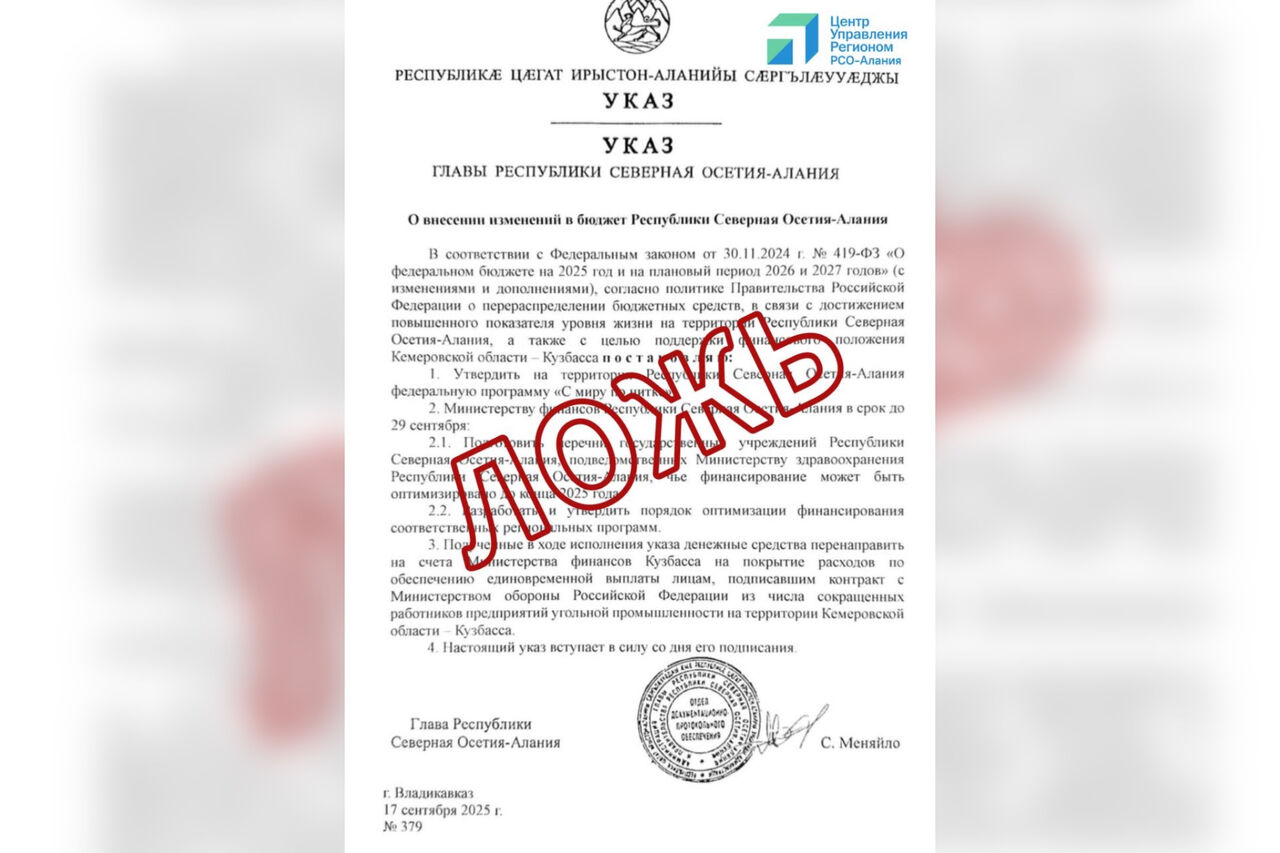 В социальных сетях появился документ, будто бы утвержденных главой Северной Осетии. Согласно этому указу, речь идет о мифической федеральной программе "С миру по нитке", предусматривающей отправку денежных средств из Осетии в Кузбасс для выплаты контрактникам.