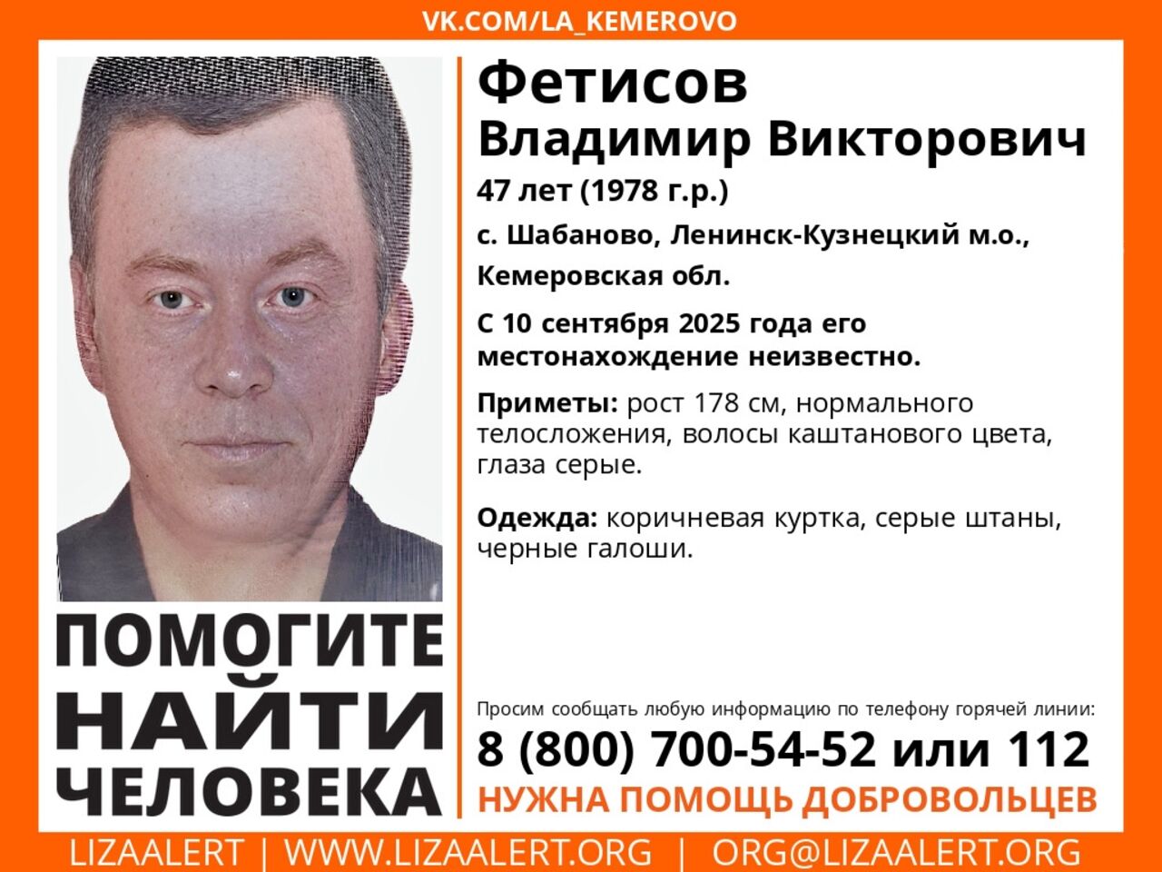 47-летний житель села Шабаново Ленинск-Кузнецкого округа Владимир Фетисов пропал без вести, о его судьбе ничего не известно с 10 сентября, сообщает 18 сентября поисковый отряд "ЛизаАлерт".
