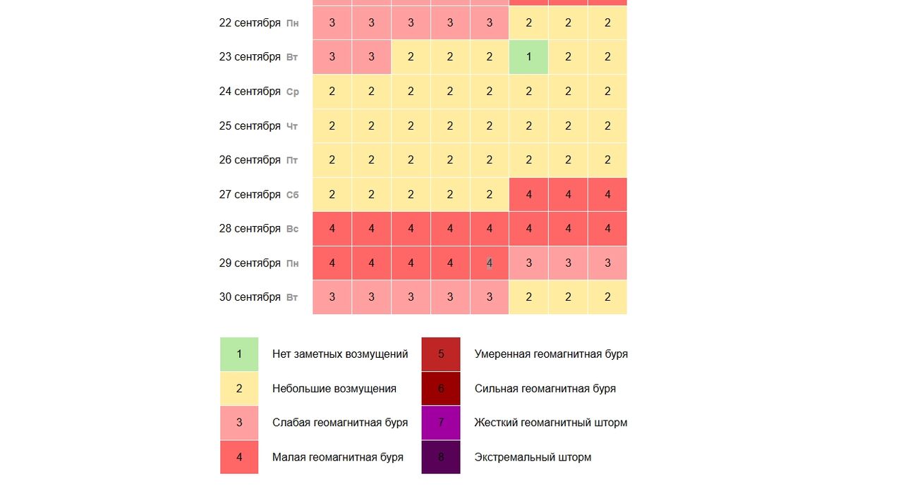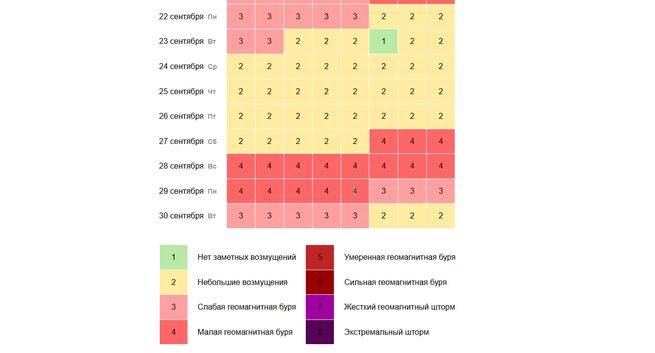 Отмечается, что интенсивность возмущений магнитного поля будет находиться в пределах "малых" значений. Однако уже вечером в понедельник, 29 сентября, они станут "слабыми", а затем и "небольшими".