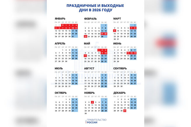 Председатель правительства РФ Михаил Мишустин подписал постановление, касающееся выходных и праздников в 2026 году. Так, в следующем году 3 и 4 января выпадает на выходные дни, поэтому в правительстве было принято решение перенести их на 9 января и 31 декабря. Тем самым новогодние праздники продлятся 12 дней – с 31 декабря 2025 года по 11 января 2026 года.