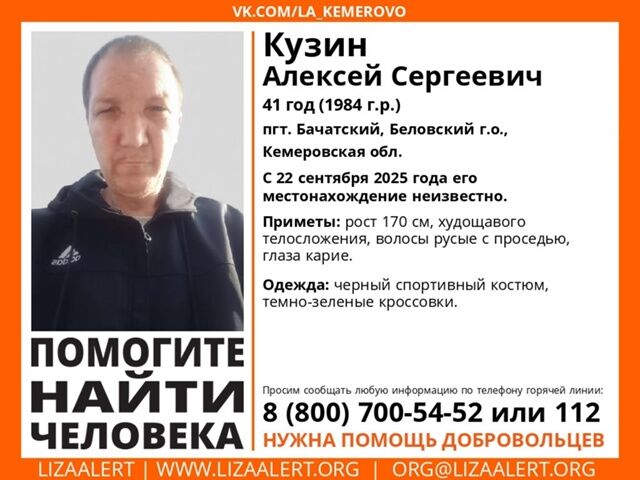 Волонтеры ПСО "ЛизаАлерт" сообщили, что в пгт Бачатский, Беловский округ, пропал 41-летний Кузин Алексей Сергеевич. Его местонахождение остается неизвестным с 22 сентября.