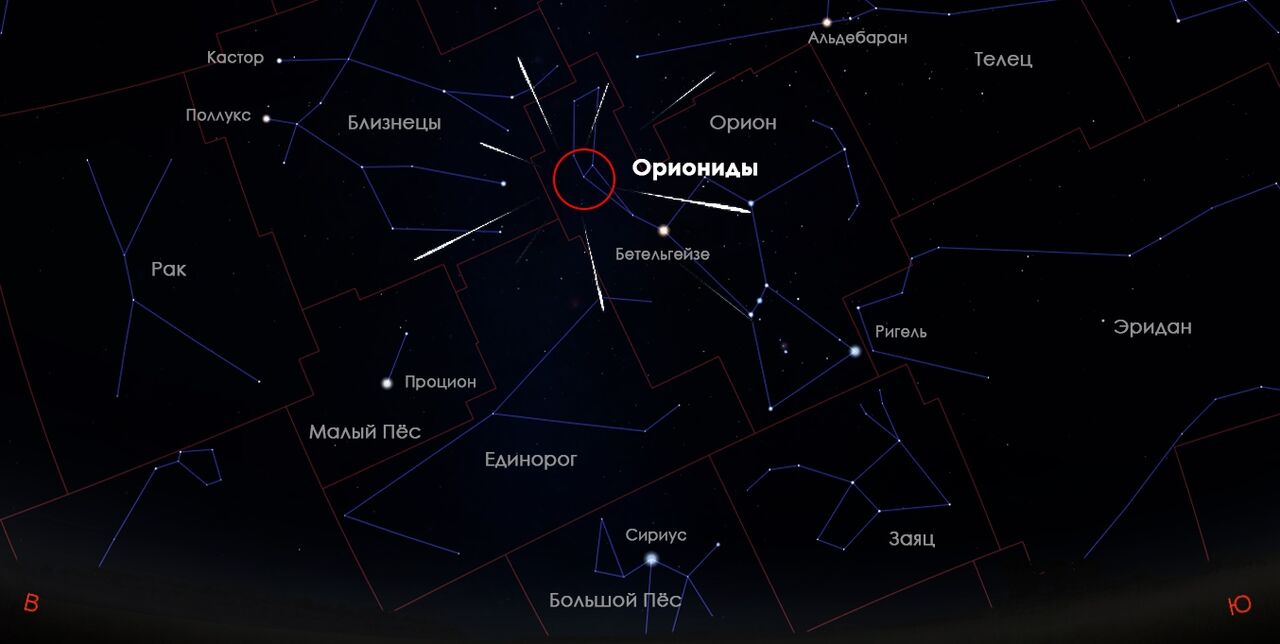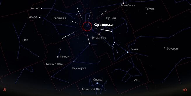 Радиант Орионид расположен в районе Ориона, поток связан с кометой Галлея. Метеоры очень быстрые (около 66 км/с), часто яркие и могут оставлять видимые следы. Частота: около 23 метеоров в час.
