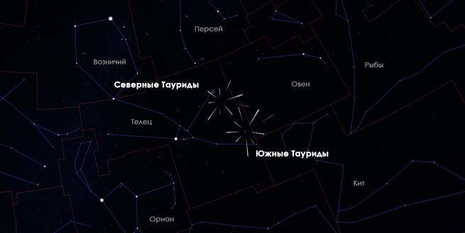 Что касается Таурид, это самый продолжительный метеорный поток, разделяющийся на южный (пик 5 ноября) и северный (пик 12 ноября). Общее число метеоров составляет всего несколько в час, но среди них временами встречаются "огненные шары". Радиант – созвездия Тельца и Дракона.