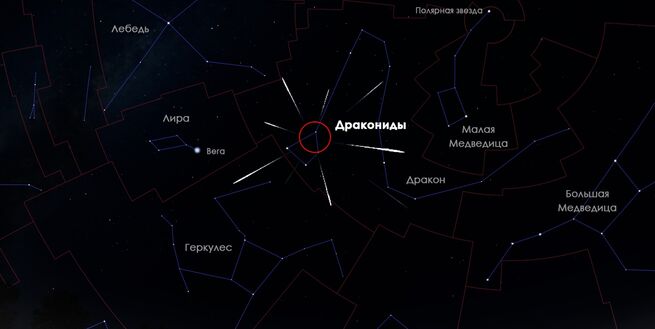 Радиант Драконид находится в созвездии Дракона. Метеоры относительно медленные (около 20 км/с) и хорошо видны ночью в северном полушарии. Источником служит комета 21P/Джакобини – Циннера. Численность метеоров сильно разнится, иногда достигая нескольких тысяч в час.