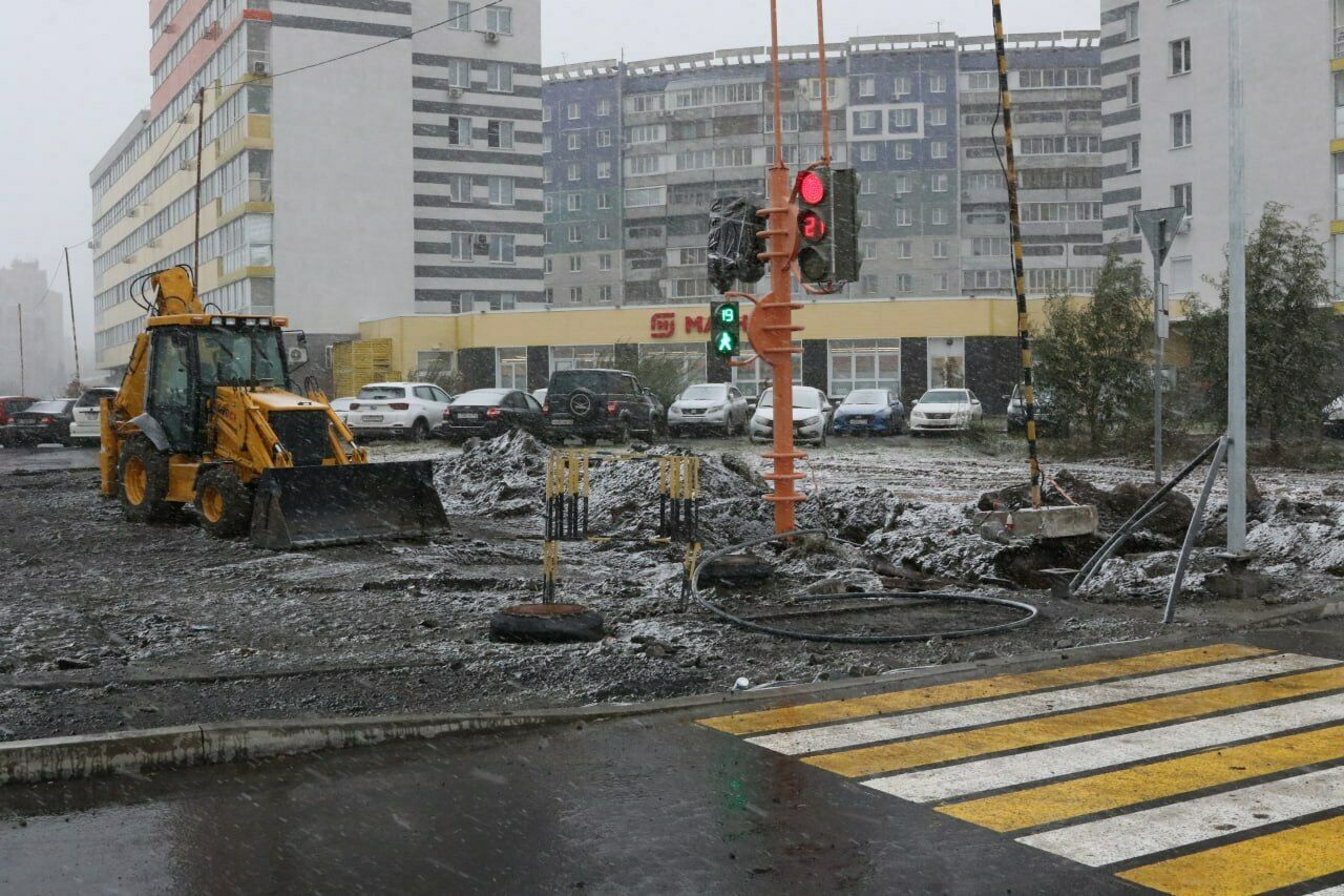 Земляные работы уже выполнены, проложены кабели для уличного освещения. Начался монтаж опор освещения и светофоров.