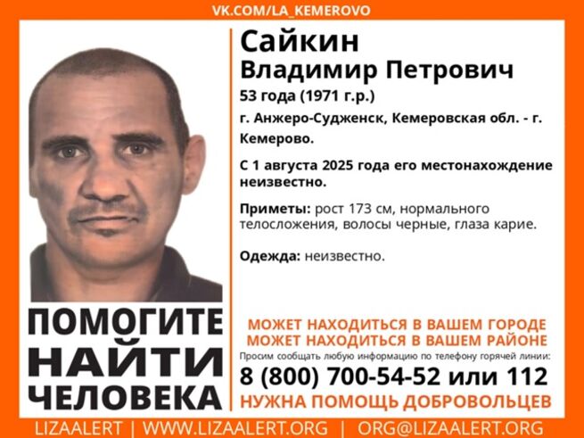 Как сообщают волонтеры ПСО "ЛизаАлерт", в Анжеро-Судженске пропал 53-летний Сайкин Владимир Петрович. Местонахождение мужчины остается неизвестным еще с 1 августа.