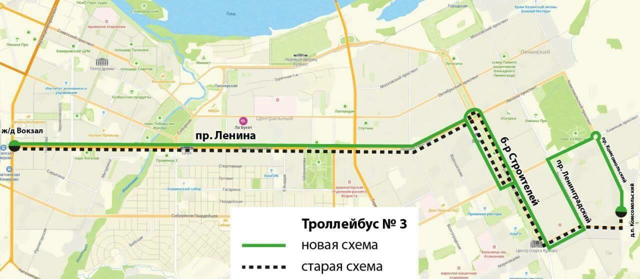 У троллейбуса появятся шесть дополнительных остановок: "Школа № 100", "ЖК Томь", "Храм Святой Троицы" (в обратном направлении – "Мебельный центр"), "ТРК Променад 2", "Стоматология", "Кузбасский парк" (только в прямом направлении). То есть "тройка" отныне будет делать крюк по Ленинградскому, Химиков и Комсомольскому.