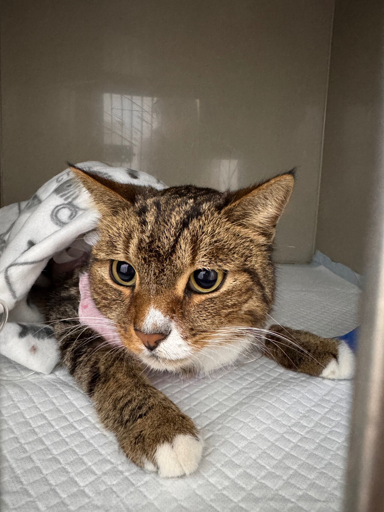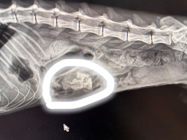 В больнице хвостатого пациента отправили на УЗИ и рентген, которые показали, что в желудке застряло что-то лишнее. Лапаротомию делать не хотели, так как кот то бегал, то "лежал как тряпочка". Но на днях владелец и врач решили, что ему нужна операция.