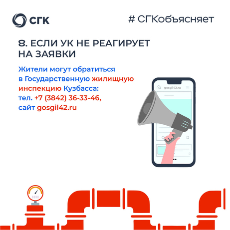 Все жалобы на отсутствие тепла принимаются только через окно управляющей компании. Если вам отказали в помощи, то следует обратиться в Государственную жилищную инспекцию Кузбасса по телефону: +7 (3842) 36-33-46