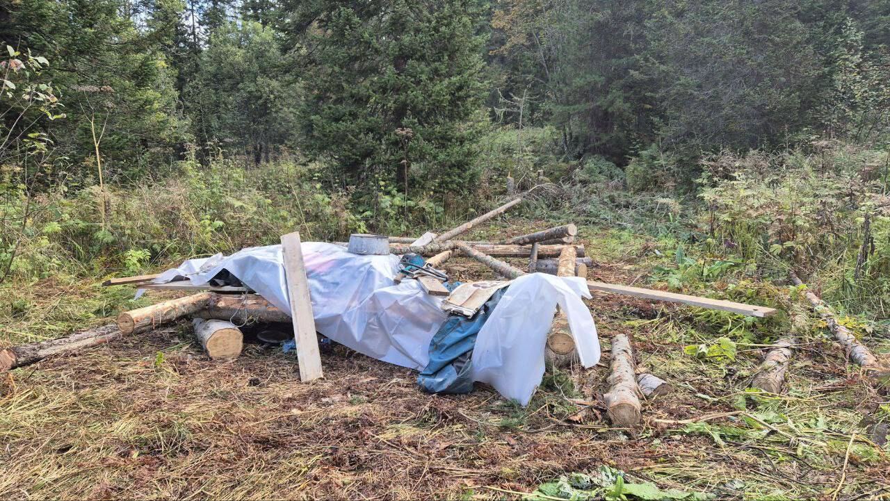 Судя по кадрам, злоумышленники распилили деревья на бревна, часть из них оставили на месте и накрыли брезентом.