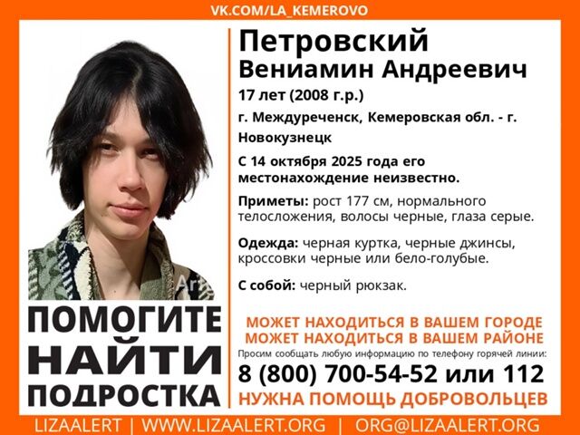 Волонтеры ПСО "ЛизаАлерт" сообщили, что в Междуреченске пропал 17-летний Петровский Вениамин Андреевич. Его местонахождение остается неизвестным с 14 октября.