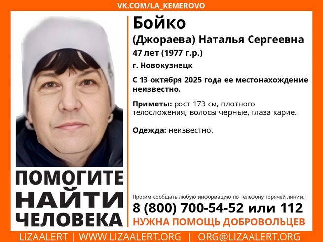 В Новокузнецке пропала 47-летняя Наталья Бойко (Джораева). Она не дает о себе знать с 13 октября, сообщили накануне в поисковом отряде "ЛизаАлерт".