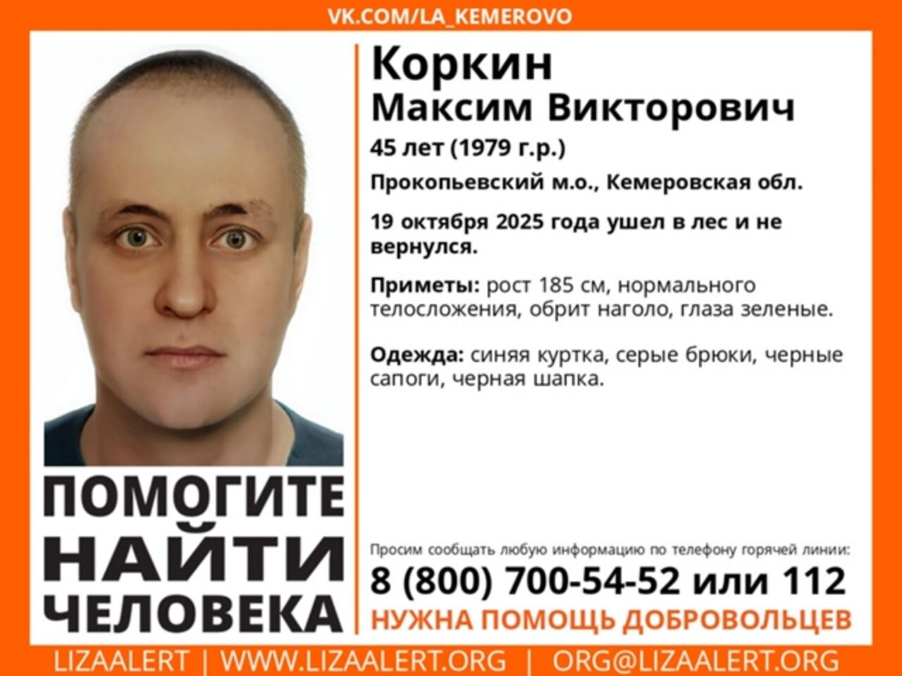 Волонтеры ПСО "ЛизаАлерт" сообщают, что в Прокопьевском муниципальном округе пропал 45-летний Коркин Максим Викторович. Мужчина ушел в лес 19 октября и не вернулся назад.