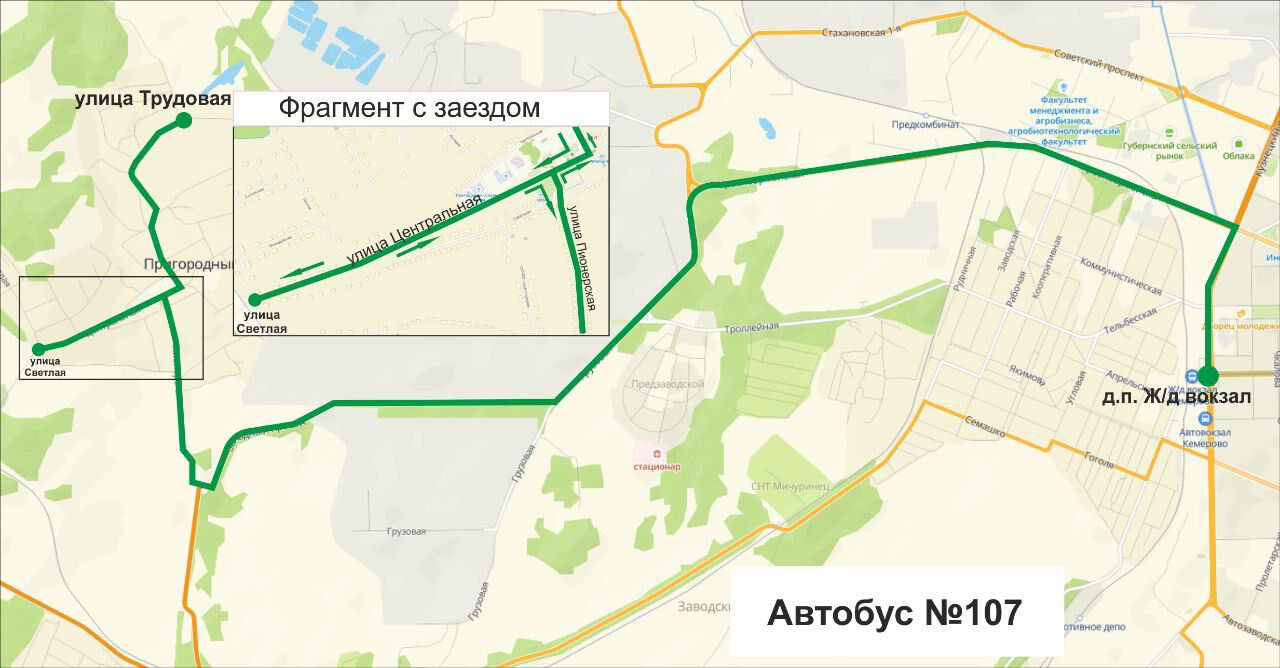 В Кемерове с 25 октября изменяется маршрут движения автобуса №107 "Железнодорожный вокзал – улица Трудовая". Теперь транспорт будет проезжать дополнительную остановку "улица Светлая" при следовании в сторону города.