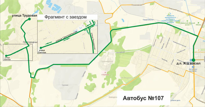 - Ж/д вокзал → проспект Кузнецкий → улицы Красноармейская, Грузовая, Западный проезд, Пионерская, Центральная, Угловая, Садовая → остановка "Трудовая".