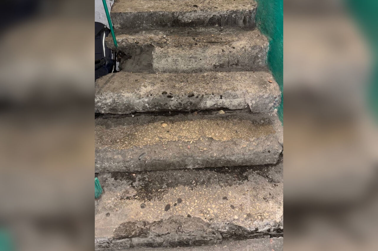 По словам местных жителей, спускаться по такой лестнице опасно, особенно если есть ребенок, так как здание дает усадку.