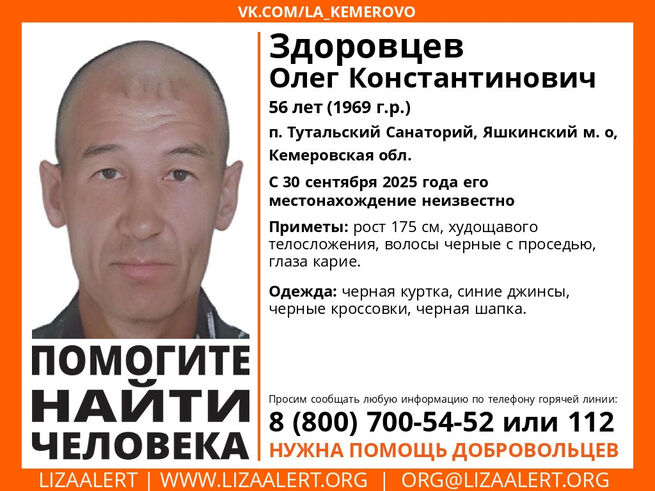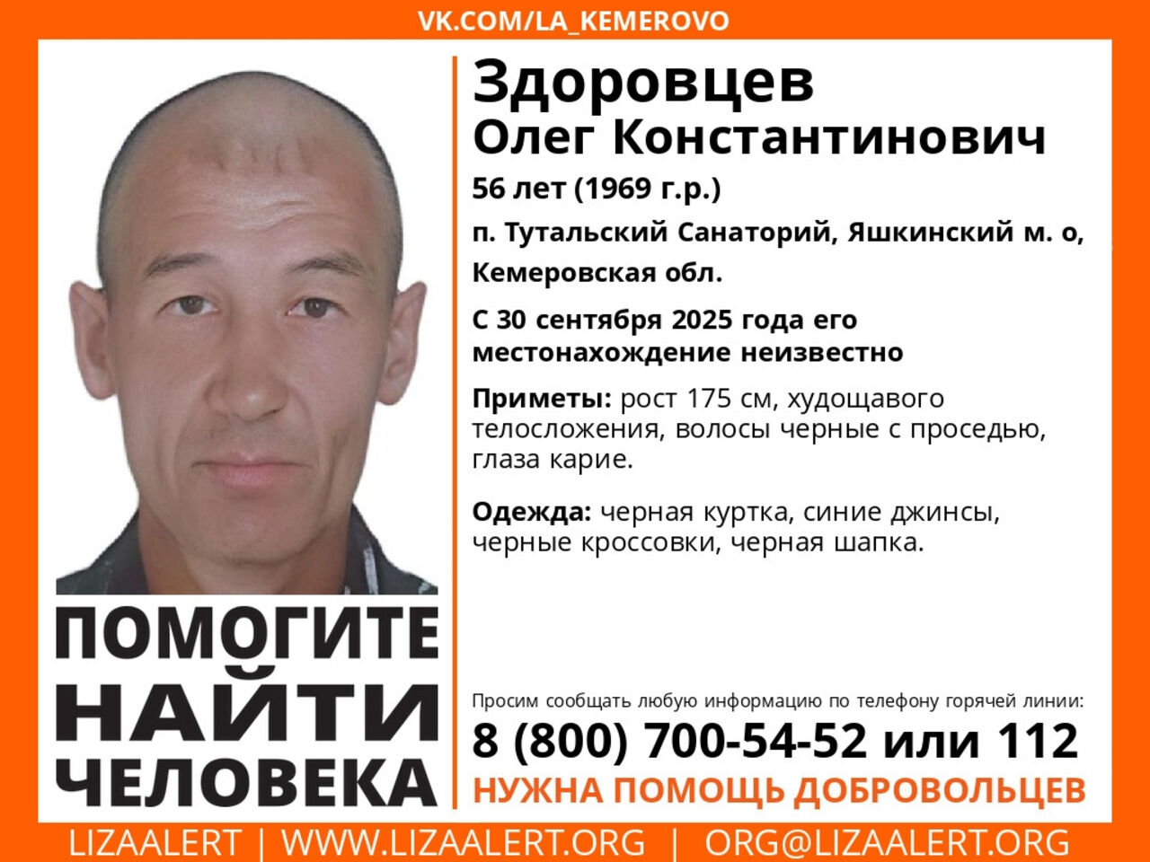 В поселке Тутальский Санаторий в Яшкинском районе Кузбасса ищут 56-летнего Олега Здоровцева, о котором ничего не известно с 30 сентября 2025 года. Об этом сообщил поисково-спасательный отряд "Лиза Алерт".