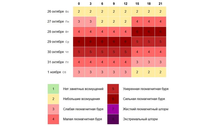 Согласно прогнозам сервиса Time-in, на текущей неделе Кузбасс окажется под влиянием магнитных бурь. Так, днем 28 октября возмущения магнитного поля достигнут "сильных" значений.
