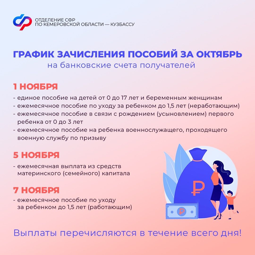 Так, выплата детских пособий будет перенесена с 3 ноября на 1 ноября. В этот день на банковские счета получателей поступят: единое пособие на детей от 0 до 17 лет и беременным женщинам, ежемесячное пособие по уходу за ребенком до 1,5 лет (неработающим), ежемесячное пособие в связи с рождением (усыновлением) первого ребенка от 0 до 3 лет, ежемесячное пособие на ребенка военнослужащего, проходящего военную службу по призыву.