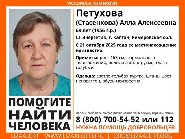 Волонтеры ПСО "ЛизаАлерт" сообщили, что в СТ Энергетик, город Калтан, пропала 69-летняя Петухова (Стасенкова) Алла Алексеевна. Местонахождение женщины остается неизвестным с 21 октября.