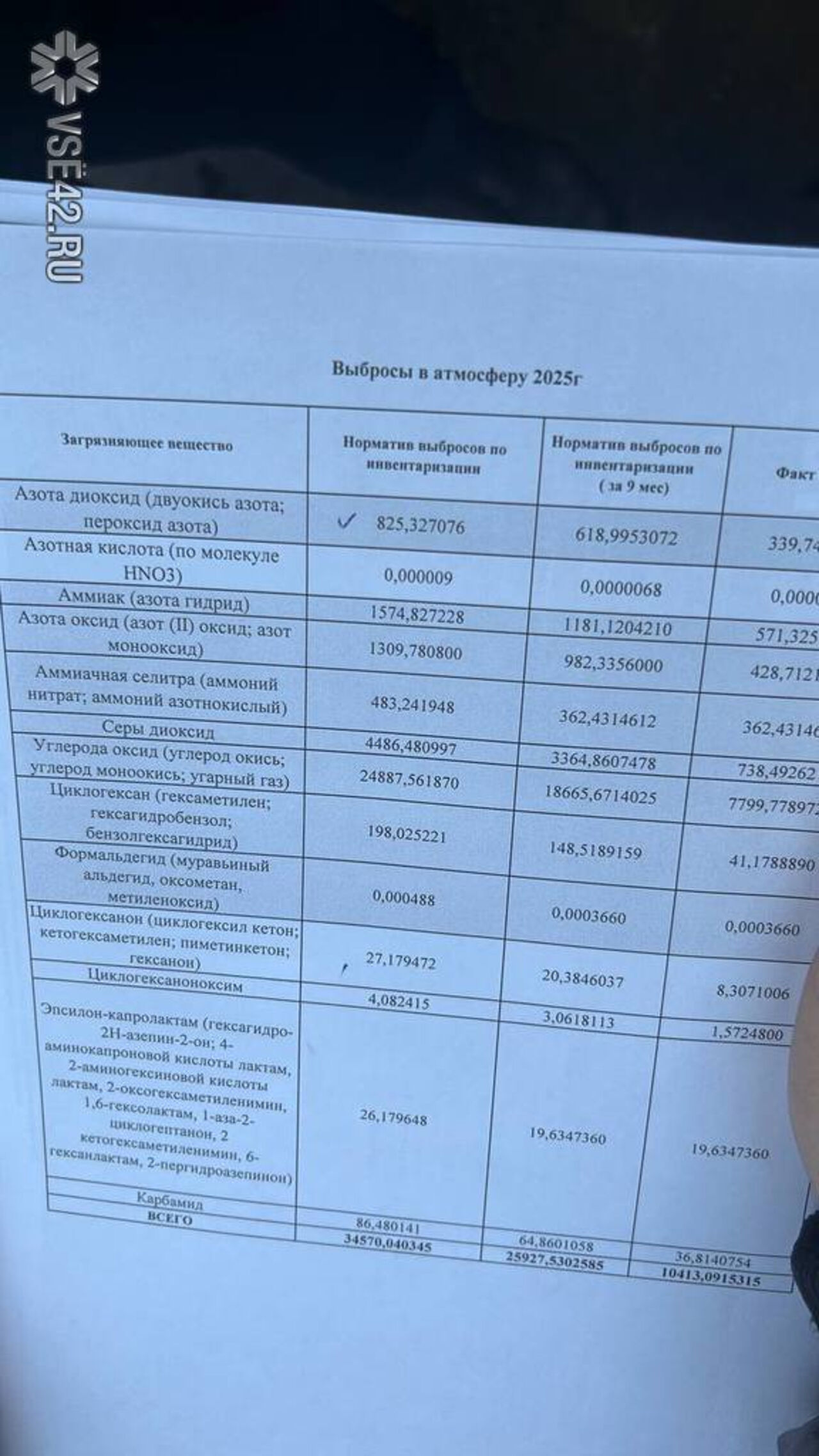 - аммиак – 571 тонна (норматив 1 181 тонна)
