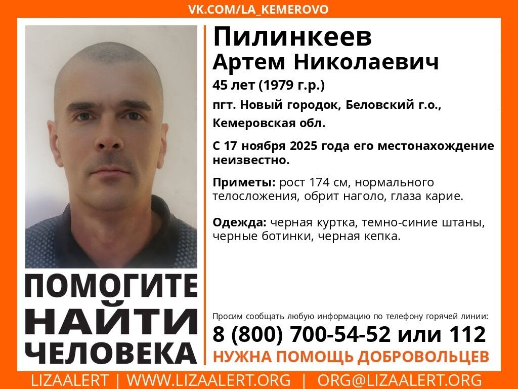 В поселке городского типа Новый городок в Беловском ГО пропал 45-летний Артем Пилинкеев. С 17 ноября 2025 года его местонахождение неизвестно, сообщает поисково-спасательный отряд "Лиза Алерт".