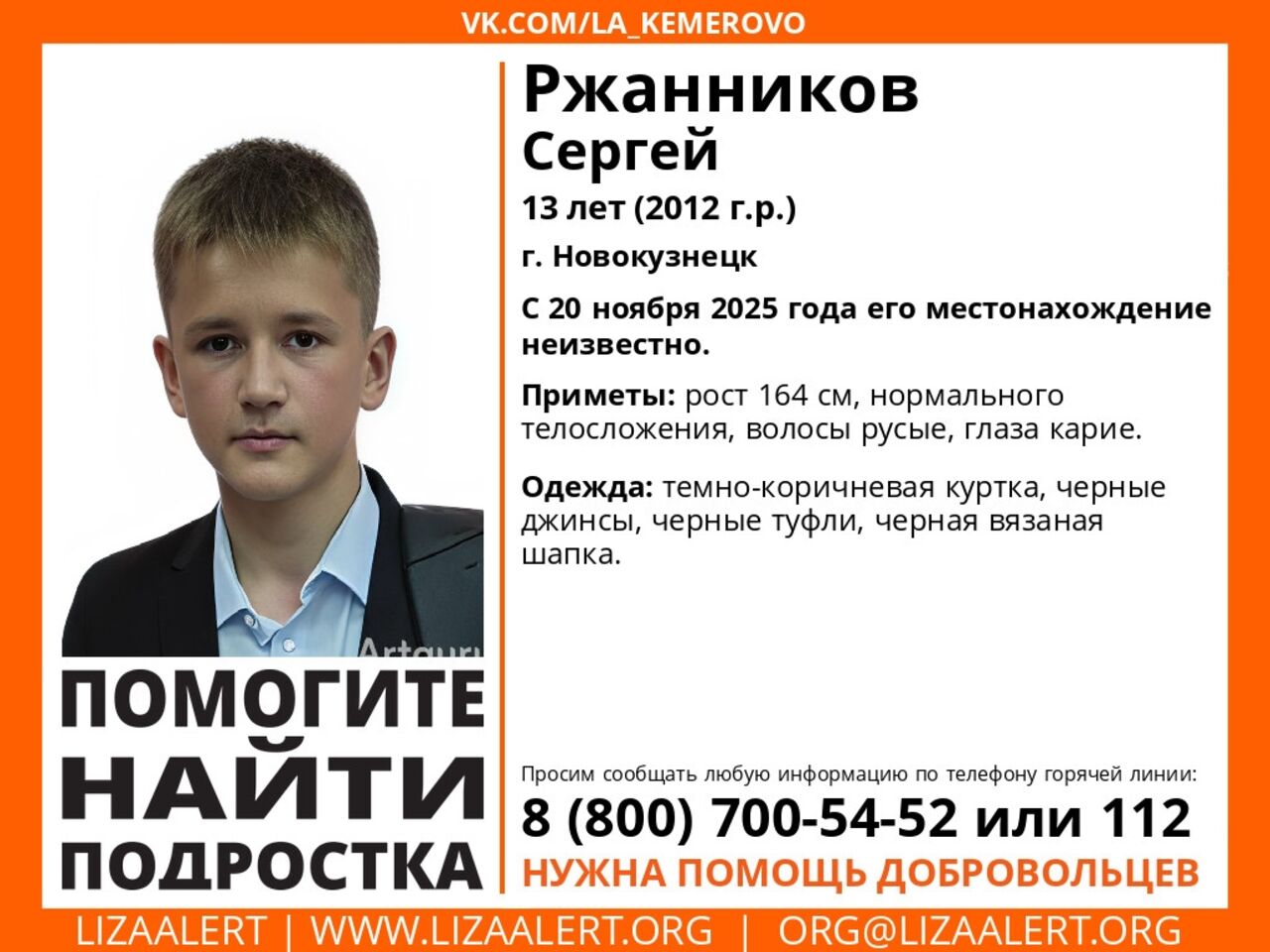13-летний Сергей ростом 164 сантиметра, с нормальным телосложением, русыми волосами и карими глазами. На нём была тёмно-коричневая куртка, чёрные джинсы, чёрные туфли и чёрная вязаная шапка.
