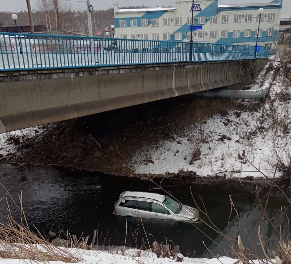 В результате транспортное средство оказалось посередине реки. К счастью, вода там не настолько глубокая, чтобы легковушка ушла на дно целиком.