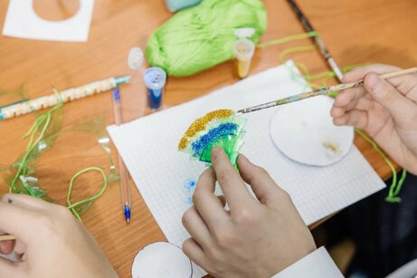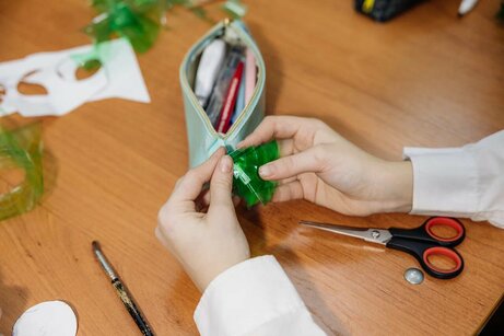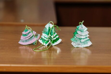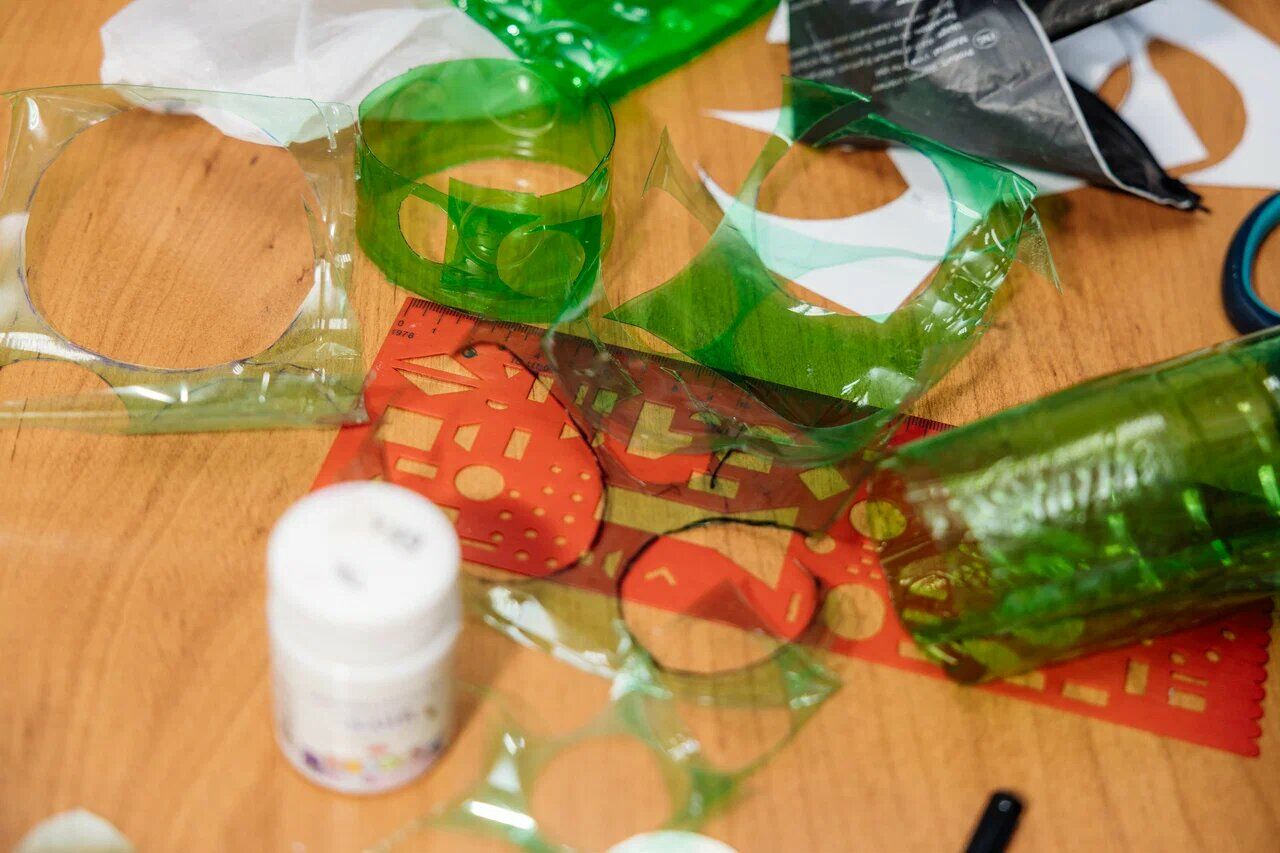 Атамановские школьники быстро включились в работу. Им раздали отрезки пластиковых бутылок зеленого цвета, многие дети также принесли "заготовки" из дома. Ребятам предложили сделать мини-елочку. Сначала вырезали детали, далее сшивали их вместе, затем – покрывали краской и блестками. 40-минутный урок пролетел незаметно. В конце у каждого была своя неповторимая ёлочка. К примеру, Варя Горянина, сделала яркое красочное деревце с интересным дизайном: