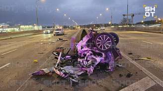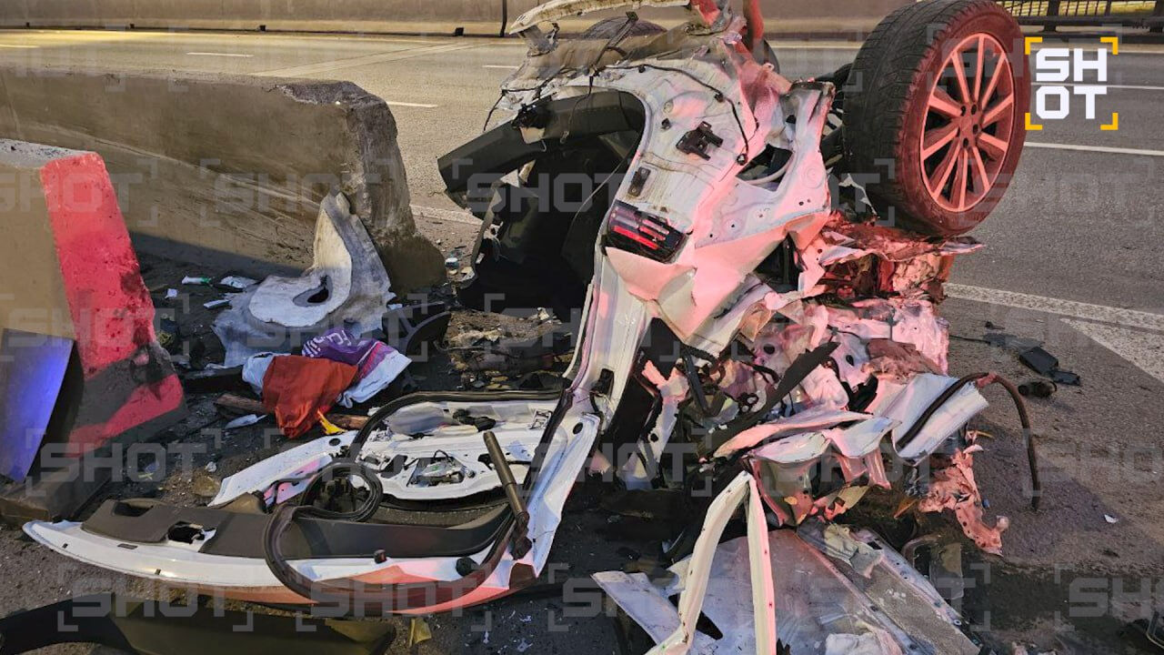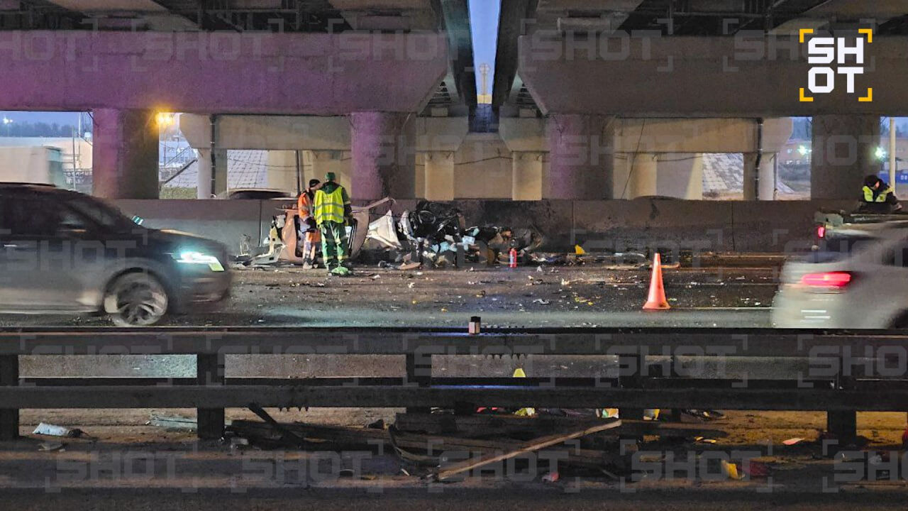 По данным Telegram-канала, одна часть легковушки осталась лежать на Алтуфьевском шоссе, а другая рухнула на полосу МКАДа. Сразу после аварии начался пожар.