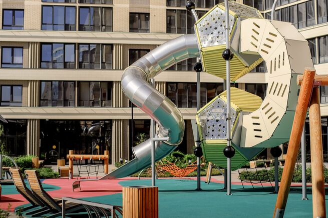 Придомовая территория "Сакура Парк". Одно из преимуществ покупки готовой квартиры – оценить качество строительства, отделку мест общего пользования, благоустройство и детские площадки.