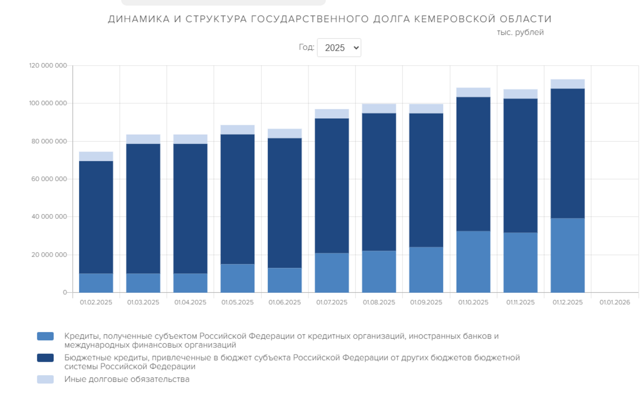 Госдолг Кузбасса на 1 декабря составил 112,7 млрд рублей, сказано на сайте областного министерства финансов. За месяц показатель вырос на 5,3 млрд рублей.