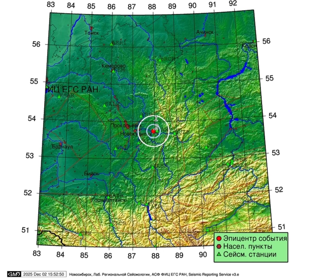 В Кузбассе на территории Междуреченского округа произошло землетрясение. Его зафиксировали 2 декабря в 22:21. Данные об этом появились в оперативной сводке Алтае-Саянского филиала Единой геофизической службы РАН.