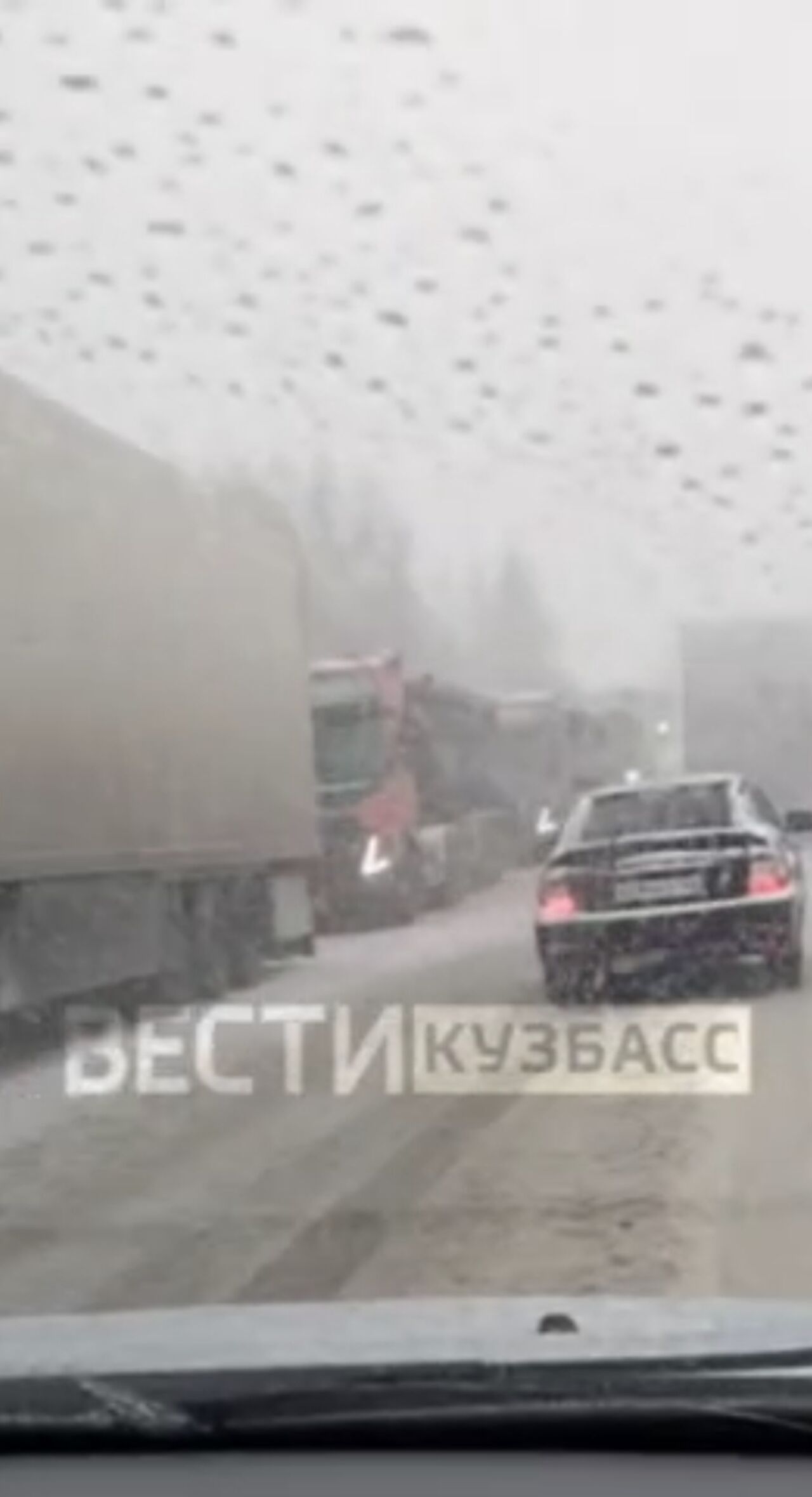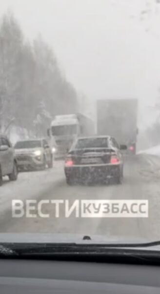 На кузбасской трассе образовалась огромная пробка из фур и легковых автомобилей. Движению помешали погодные условия.