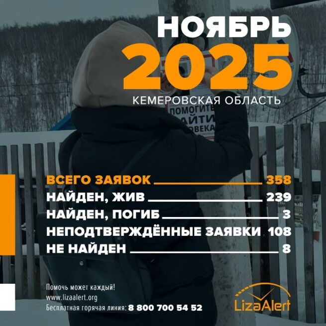 ПСО "ЛизаАлерт" сообщает, что в ноябре текущего года в отряд поступило 358 заявок на поиск пропавших. Так, живыми были найдены 239 человек, погибшими – трое. Так и не нашли восемь человек, а еще 108 заявок остались неподтвержденными.
